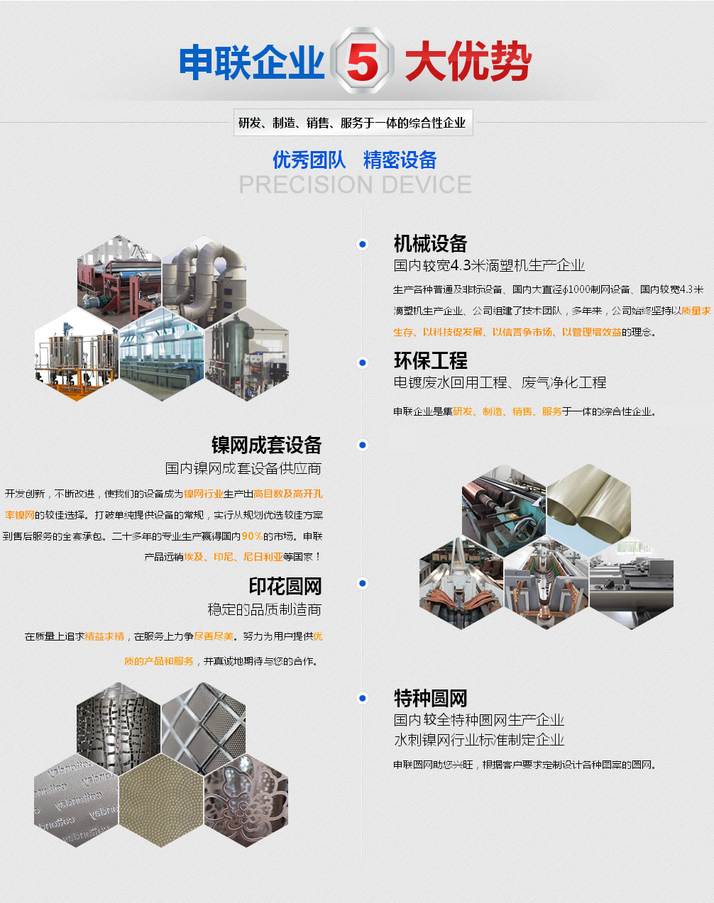 主要產(chǎn)品:機(jī)械設(shè)備、環(huán)保工程、鎳網(wǎng)生產(chǎn)成套設(shè)備、印染鎳網(wǎng)、特種鎳網(wǎng)等系列產(chǎn)品的研發(fā)、制造、銷售、服務(wù)于一體的綜合性企業(yè)。